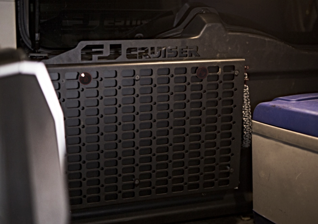 Are you experiencing storage issues due to limited space in your FJ Cruiser? Bid farewell to clutter and disorganisation with our innovative Personal Storage Device (PSD) rack system. The fold-down table storage Molle system is designed to enhance your driving experience by providing ample space to keep essential items neatly organised. This drop-down table is designed for off-roading adventurers who like to bring their refrigerators with them. The half drop-down is made so you can have room for it all.